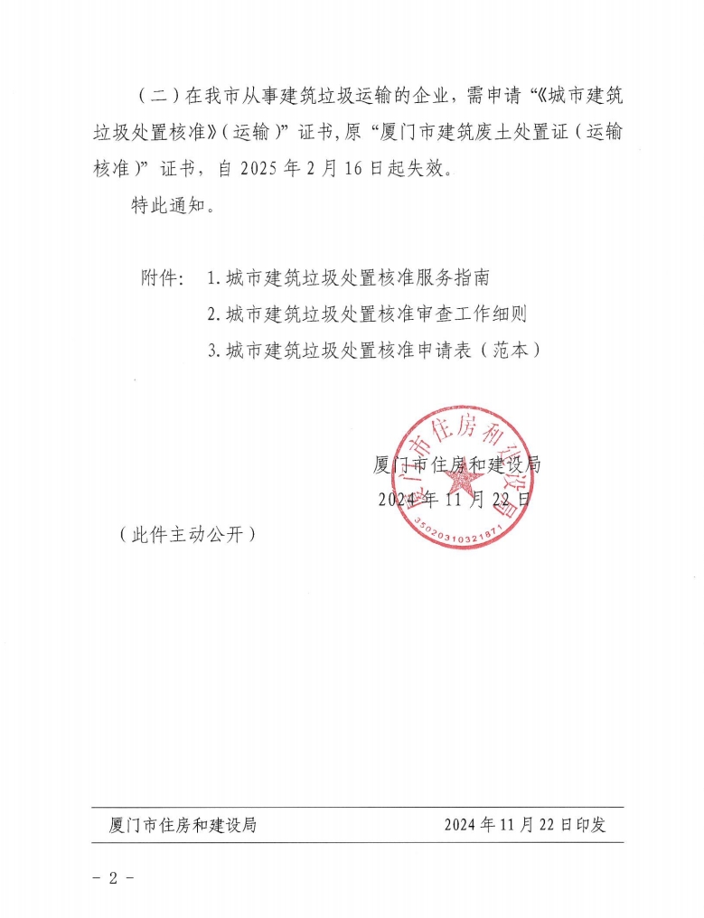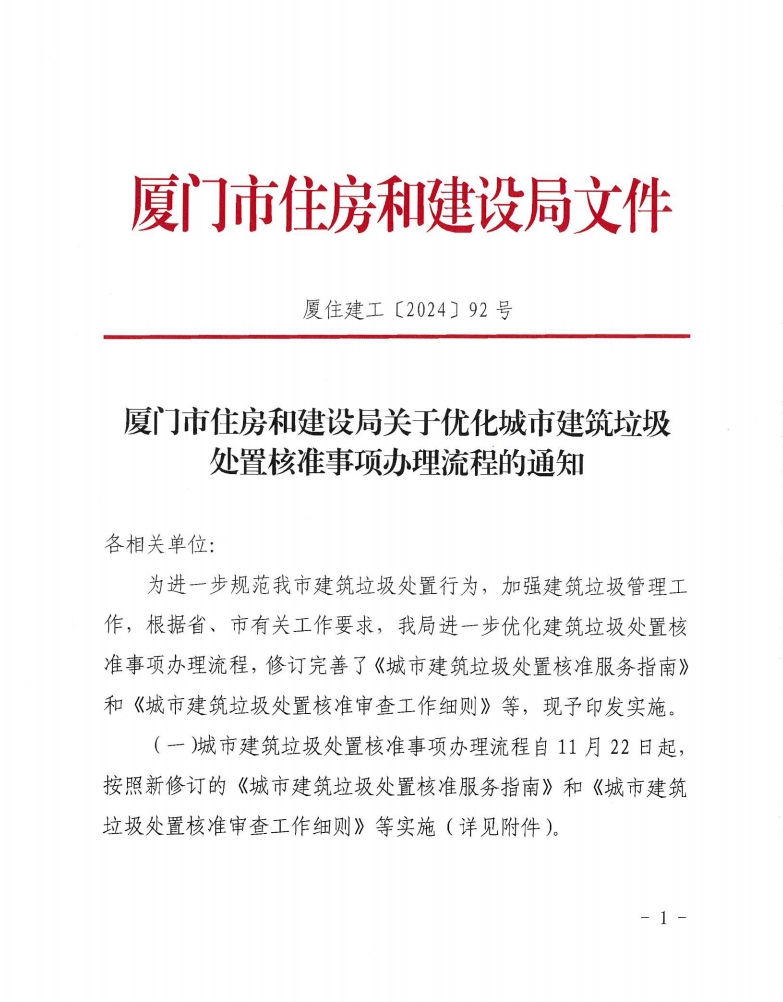 厦门市住房和建设局关于优化城市建筑垃圾 处置核准事项办理流程的通知