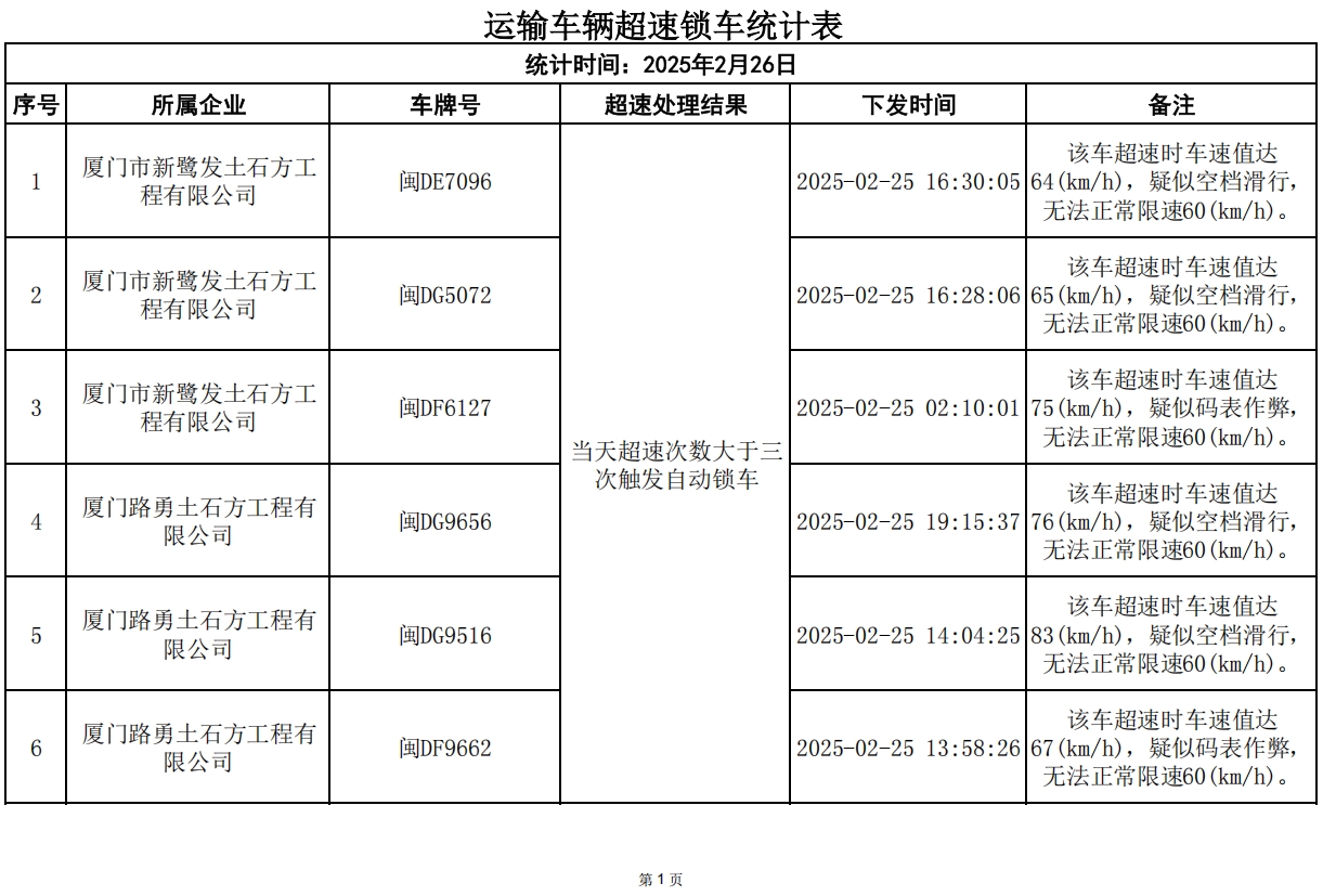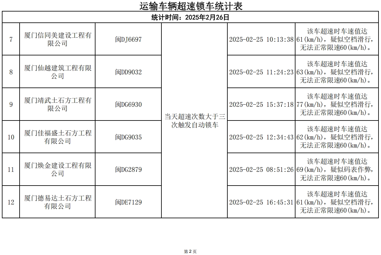 2月25日,因违规而锁车车辆:13辆次。厦门市新鹭发土石方工程有限公司、厦门路勇土石方工程有限公司各超速锁车3辆次,厦门信同美建设工程有限公司、厦门仙越建筑工程有限公司、厦门靖武土石方工程有限公司、厦门佳福盛土石方工程有限公司、厦门焕金建设工程有限公司、厦门德易达土石方工程有限公司、福建圣蓝意建设工程有限公司各超速锁车1辆次,请各相关建筑废土运输企业引以为戒,落实驾驶员安全教育工作。