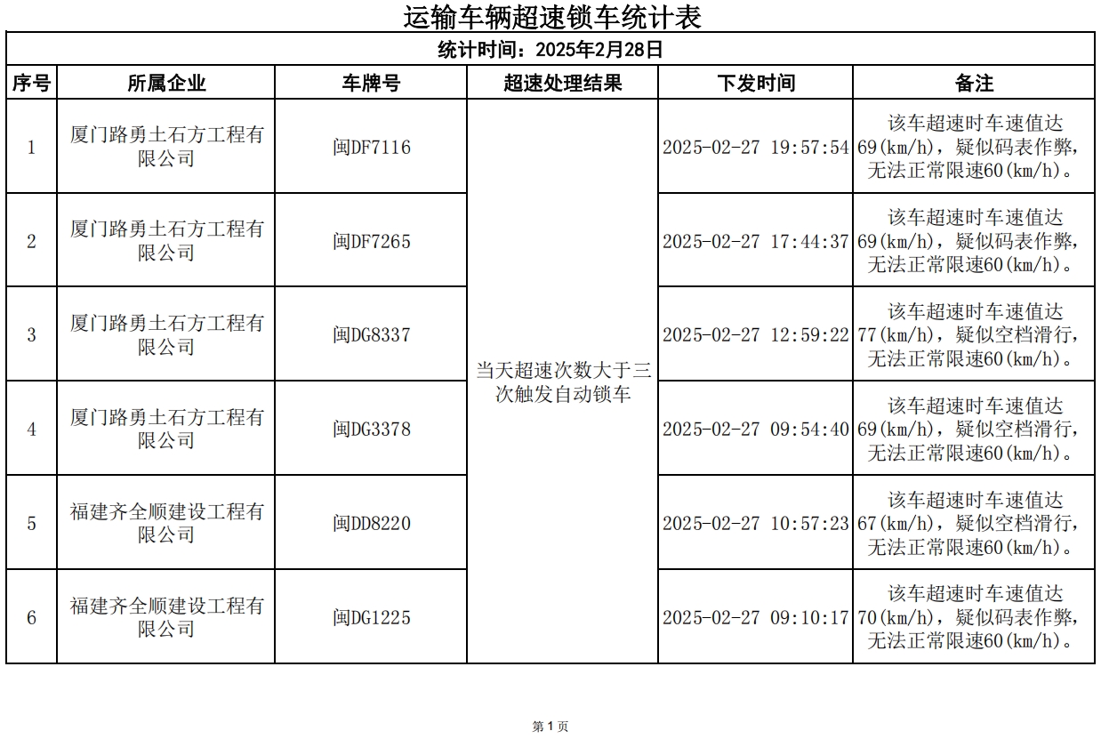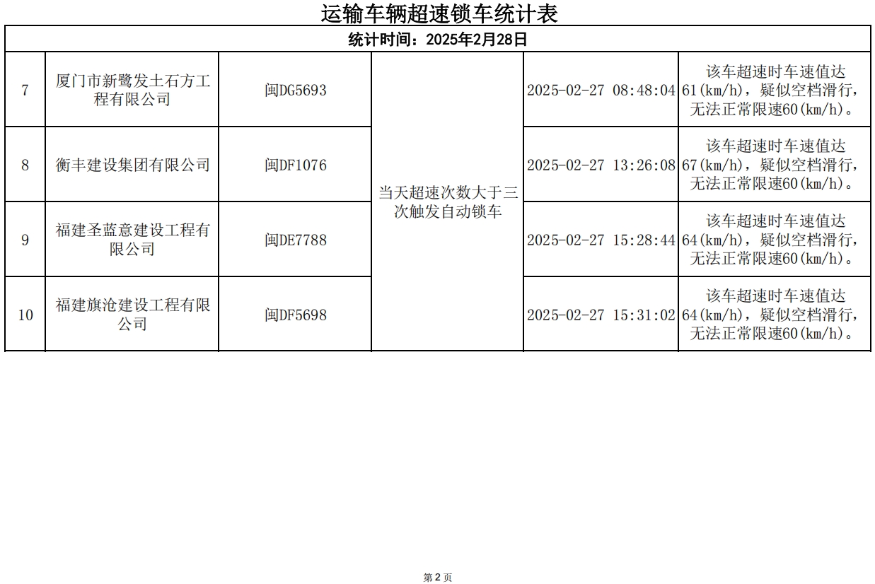 2月28日,因违规而锁车车辆:10辆次。厦门路勇土石方工程有限公司超速锁车4辆次,福建齐全顺建设工程有限公司超速锁车2辆次,厦门市新鹭发土石方工程有限公司、衡丰建设集团有限公司、福建圣蓝意建设工程有限公司、福建旗沧建设工程有限公司各超速锁车1辆次,请各相关建筑废土运输企业引以为戒,落实驾驶员安全教育工作。