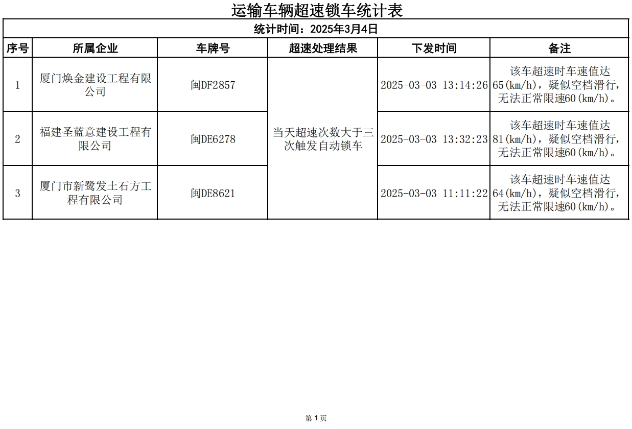 3月3日,因违规而锁车车辆:3辆次。厦门焕金建设工程有限公司、福建圣蓝意建设工程有限公司、厦门市新鹭发土石方工程有限公司各超速锁车1辆次,请各相关建筑废土运输企业引以为戒,落实驾驶员安全教育工作。