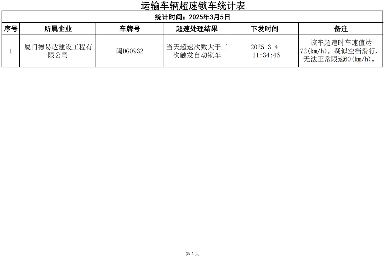 3月4日,因违规而锁车车辆:1辆次。厦门德易达建设工程有限公司超速锁车1辆次,请各相关建筑废土运输企业引以为戒,落实驾驶员安全教育工作。