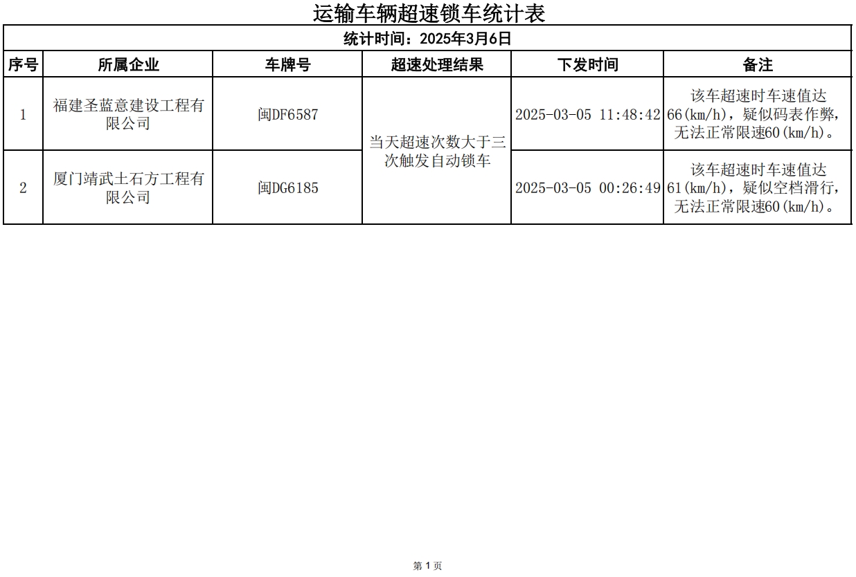 3月5日,因违规而锁车车辆:2辆次。福建圣蓝意建设工程有限公司、厦门靖武土石方工程有限公司各超速锁车1辆次,请各相关建筑废土运输企业引以为戒,落实驾驶员安全教育工作。