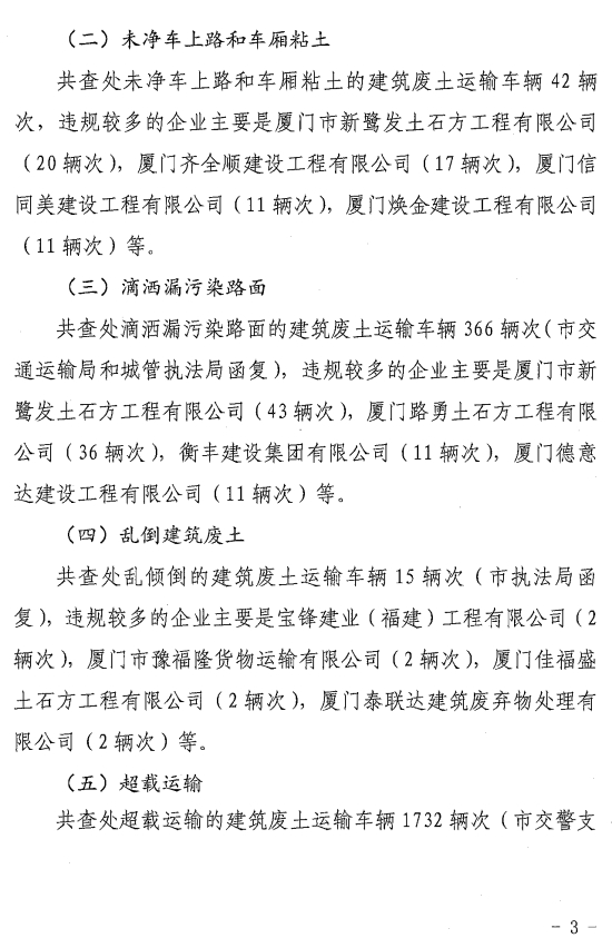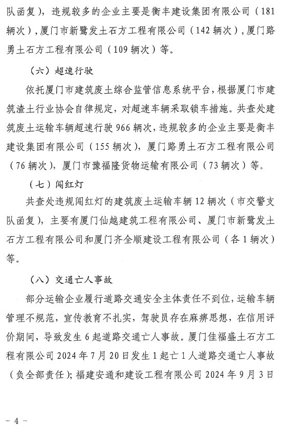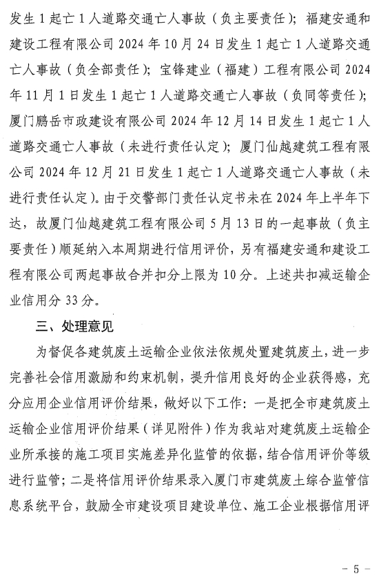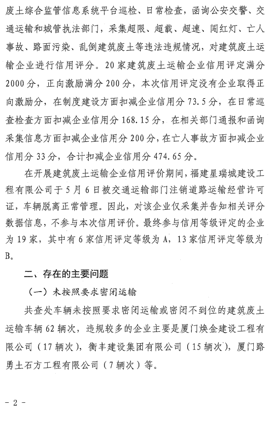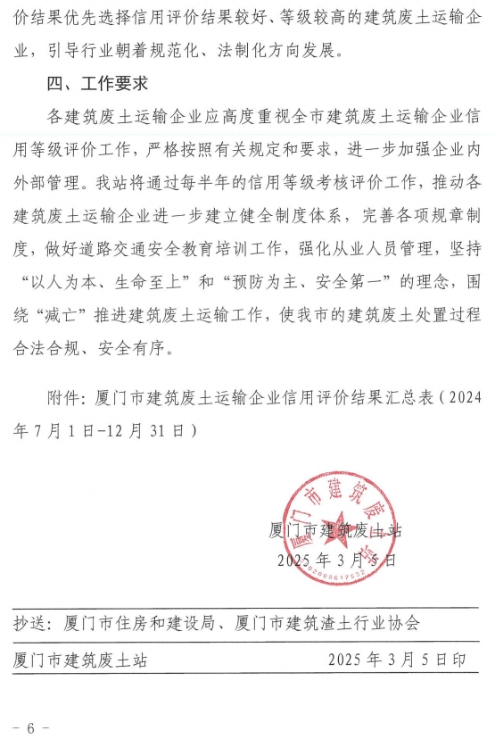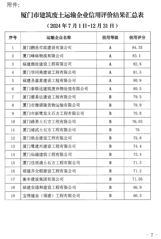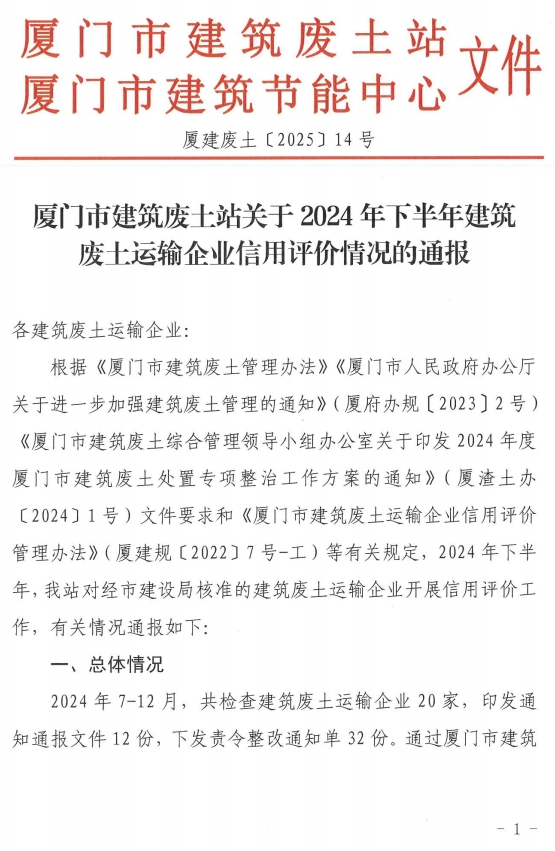 厦门市建筑废土站关于2024年下半年建筑废土运输企业信用评价情况的通报