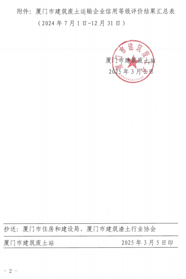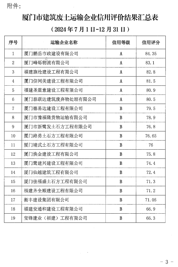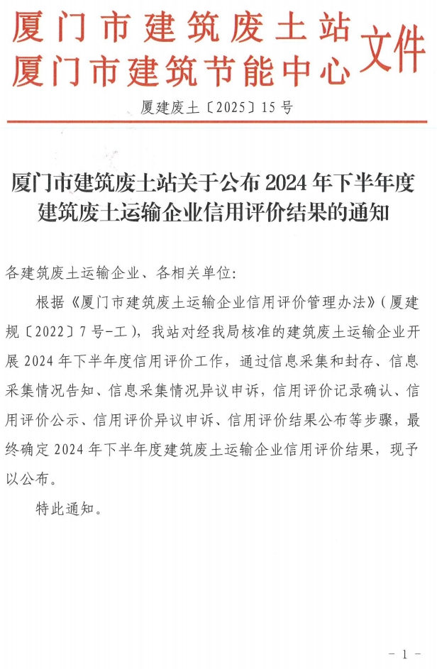 厦门市建筑废土站关于公布2024年下半年度建筑废土运输企业信用评价结果的通知