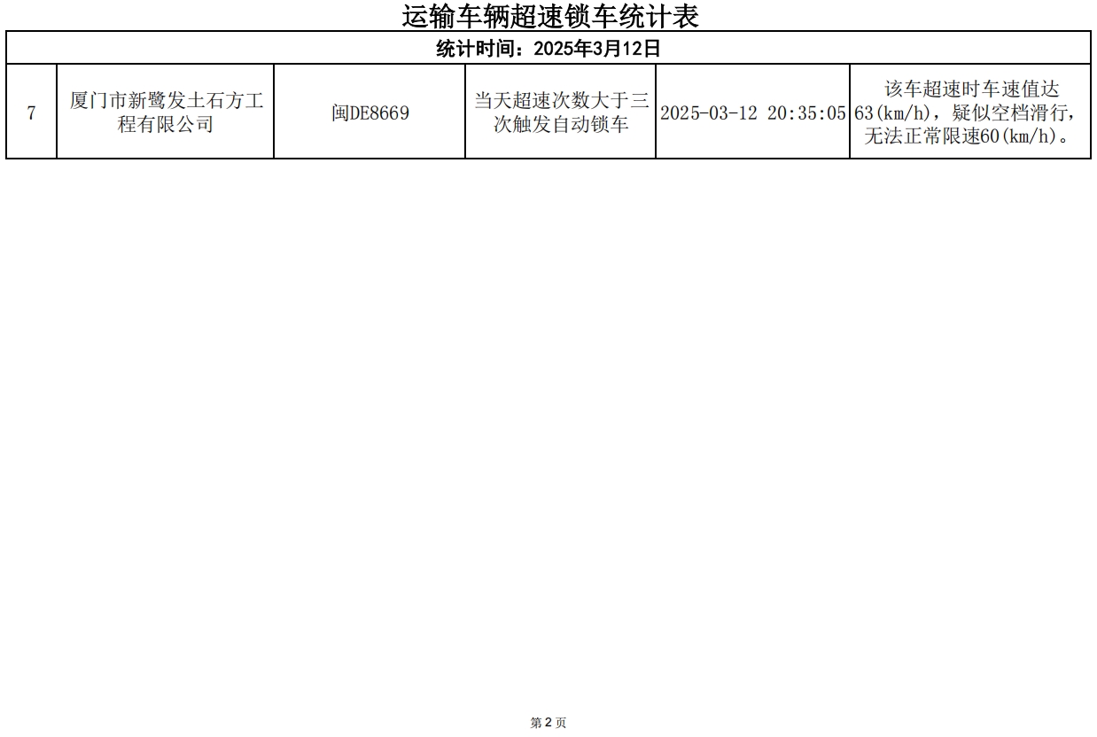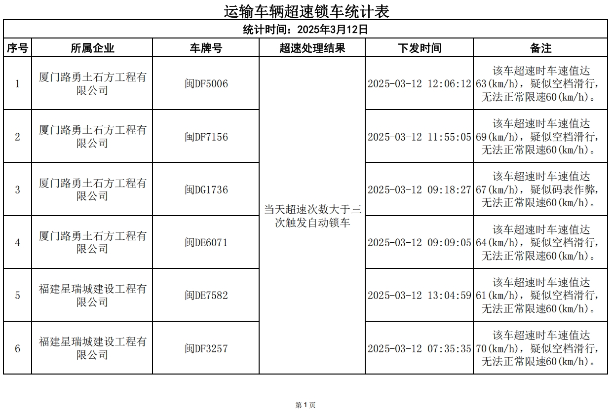 3月12日,因违规而锁车车辆:7辆次。厦门路勇土石方工程有限公司超速锁车4辆次,福建星瑞城建设工程有限公司超速锁车2辆次,厦门市新鹭发土石方工程有限公司超速锁车1辆次,请各相关建筑废土运输企业引以为戒,落实驾驶员安全教育工作。